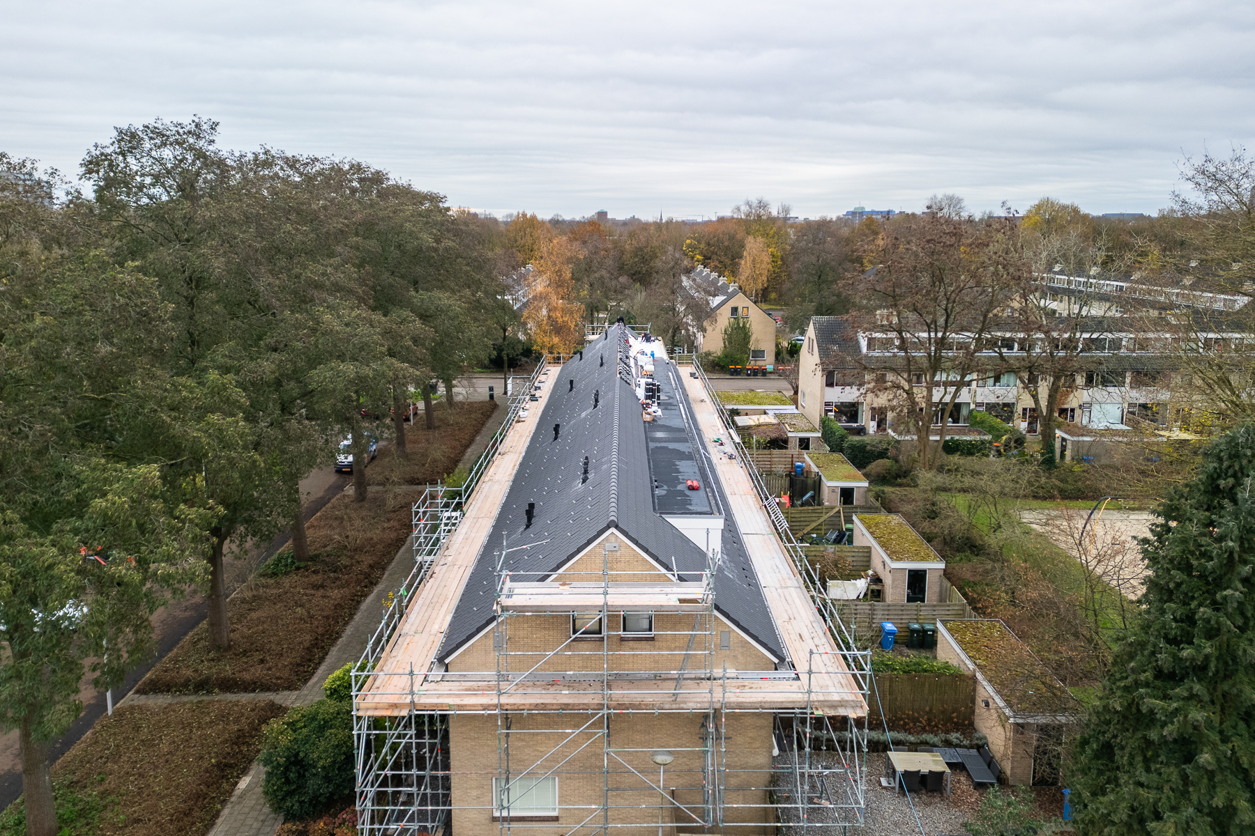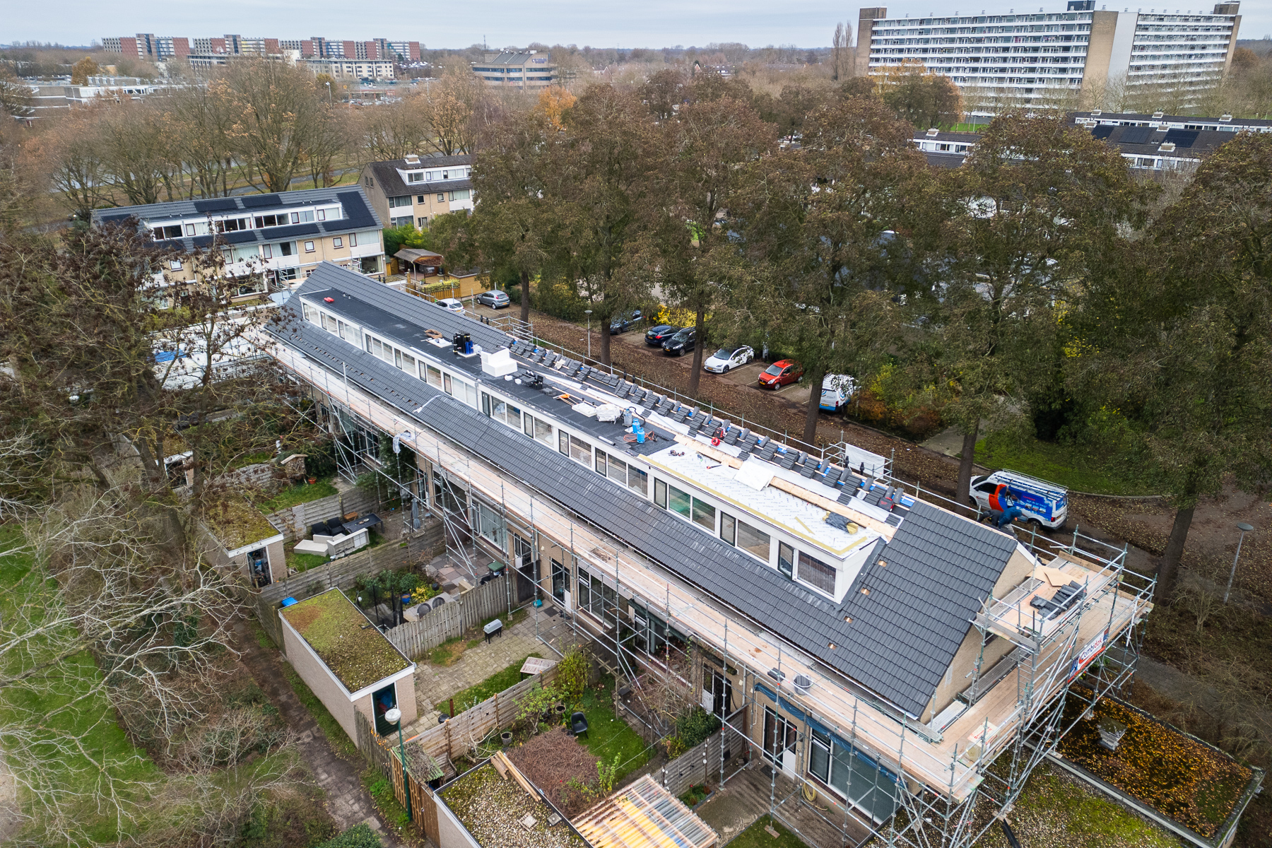 De kern van de opdracht is woningen toekomstbestendig maken door het dak te renoveren en te isoleren. “Het project valt onder groot onderhoud. Omdat de dakpannen aan vervanging toe waren, heeft de opdrachtgever besloten direct de daken na te isoleren,” verduidelijkt Berry. Daarvoor worden eerst de bestaande pannen, panlatten en constructies verwijderd. Daarna worden op het bestaande dakbeschot nieuwe, geïsoleerde dakelementen aangebracht, gevolgd door nieuwe dakpannen en zonnepanelen. Ook de dakkapellen, die vaak niet geïsoleerd zijn, worden gelijk meegenomen en krijgen nieuwe dakbedekking.